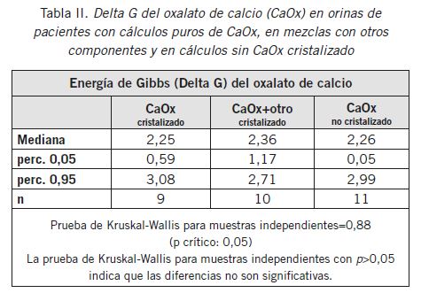 Los compuestos con DG positivos predicen la posibilidad de que se forme el cristal en las condiciones estudiadas, pero no pueden asegurar que esto ocurra. En la Tabla II, las medianas de los DG de las orinas pertenecientes a los 9 cálculos de oxalato de calcio como componente único, de los 9 con composición de oxalato de calcio y otro componente y de aquellos donde el oxalato de calcio no cristalizó, el test de Kruskal Wallis para muestras independientes fue de 0,88 (pc: 0,05), lo que indica fuertemente que no había diferencias significativas entre ellos. Se confirma así que por ser energéticamente posible no hay compromiso de que deba formarse el cálculo. Coincide con lo encontrado por Pak et al. en que en los sujetos formadores de cálculos de fosfato cálcico o mixtos de oxalato cálcico-fosfato cálcico, la tasa de formación de cálculos no depende de la saturación urinaria de oxalato de calcio (18).