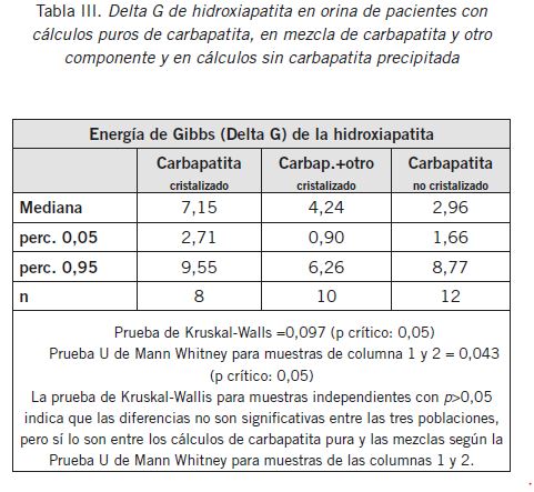 En forma similar, en la Tabla III se comparan las medianas de los DG de los 8 pacientes con cálculos de carbapatita pura, de los 10 con cálculos de carbapatita y otro componente y de los 12 donde no precipitó la carbapatita. La prueba de Kruskal-Wallis para muestras independientes dio 0,097, lo que indica que las diferencias no son significativas entre las tres poblaciones. Cuando se compararon solo los DG de los cálculos de carbapatita puros con los de mezclas con otro componente, la prueba U de Mann Whitney dio 0,043 (p<0,05), lo que indica que la distribución de estas categorías es diferente (Tabla III).