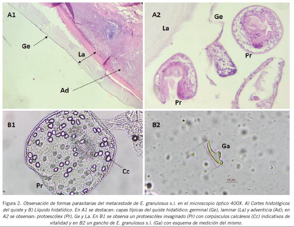 Para el estudio de ganchos rostelares, la variable considerada fue el largo total de ganchos grandes (LTG) (Fig. 2, B2). Se midieron 15 LTG en el microscopio óptico con el software Leica LAS EZ (v3.2.1). El valor promedio fue 21,2 γm ± 1,9 γm. Se aplicó el punto de corte validado LTG=26,5 μm (8). Las medidas menores se corresponden con E. granulosus s.s. y las mayores con otras especies de E. granulosus s.l. (8). El material se preservó para realizar los estudios moleculares que permitirán confirmar la identificación del genotipo.