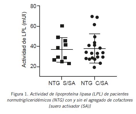 Los intervalos de referencia de la actividad de LPL en este laboratorio se obtuvieron a partir del grupo NTG. En la Figura 1 se observa que la actividad de la enzima no varía con el agregado de suero humano normal, por lo que se estableció un valor de referencia único independiente del agregado de cofactores.
