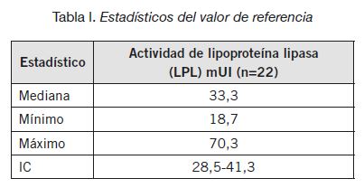 Los ensayos in vitro para la evaluación de la actividad de LPL en plasma posheparina (PPH) fueron desarrollados hace ya muchos años. Se trata de procedimientos manuales complejos, que emplean diferentes sustratos y métodos de detección, inhibidores de otras lipasas y dependen de la experiencia del laboratorio de diagnóstico (13). A pesar de estas limitaciones, estos métodos aún se consideran el estándar de oro para la evaluación de la actividad enzimática (14). Por lo tanto, dado que los valores de referencia dependen de la complejidad del método y de la diversidad de condiciones utilizadas, cada laboratorio debe establecer los propios, teniendo en cuenta que los intervalos de actividad normal de LPL no son necesariamente intercambiables. En este sentido, es importante destacar que, si se utiliza la actividad de LPL para el diagnóstico de SQF, es necesaria la estandarización de las metodologías y los valores de corte (15) (16). Además, es necesario resaltar que, dada la naturaleza, tanto de la muestra utilizada para medir la actividad de LPL como del ensayo manual utilizado, el número de individuos incluidos en el trabajo para la obtención del intervalo de referencia (IR) es relativamente pequeño, aunque ha sido contrastado y transferido con el IR obtenido hace varios años en este laboratorio.