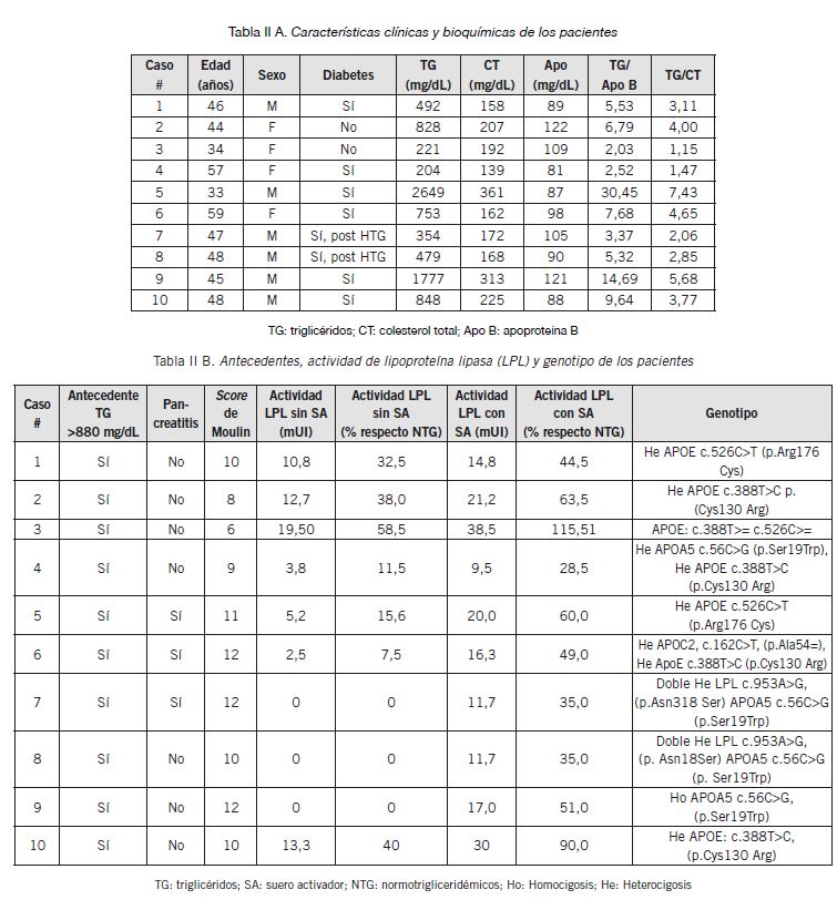 En la Tabla II A se describen las características clínicas y el perfil lipídico lipoproteico de los 10 pacientes; a partir de estos datos se estimaron los índices ApoB/TG y TG/colesterol total. En la Tabla II B se muestra el score de Moulin, el máximo valor de TG, la actividad de LPL y el estudio genético. Todos los pacientes presentaron antecedentes de TG >880 mg/dL en una o varias oportunidades. Como puede verse, de los 10 pacientes, 7 presentaron un score de Moulin ≥10 y se consideró muy probable la presencia de SQF. Un paciente presentó score de Moulin ≤9 (SQF: improbable) y dos ≤8 (SQF: muy improbable). De los 7 pacientes con score ≥10, dos fueron doble heterocigotas para mutaciones sin sentido en APOA5 y LPL (# 7 y 8), y uno homocigota para una mutación sin sentido en APOA5 (# 9), en tanto que cuatro presentaron resultados del estudio genético incompatibles con SQF. En tres de estos últimos pacientes el gen afectado fue APOE (# 1, 5 y 10). El restante fue un aparente heterocigota para una mutación sin sentido en APOC2 (# 6).