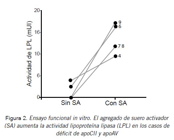 El agregado de cofactores (apoCII y apoAV) en el ensayo funcional in vitro permite desenmascarar la falta de éstos. En el presente trabajo, en los controles NTG no hubo diferencias con y sin el agregado de cofactores, lo que permitió establecer un valor de actividad de LPL de referencia único. Sin embargo, en los casos de dos pacientes con mutaciones en APOC2 y APOA5, se verificó un aumento de actividad ante el agregado de cofactores y se observó que estos resultados coincidieron con el estudio genético, lo que indica que la deficiencia de activadores se traduce en un déficit de actividad de LPL y que este ensayo representa una validación in vitro de las mutaciones. Más aún, en uno de los pacientes el ensayo funcional demostró un aumento de actividad de LPL, sin identificación de mutación en ninguno de los genes relacionados a SQF, lo que permite sospechar mutaciones en genes aún no descriptos como involucrados en la regulación de la enzima.