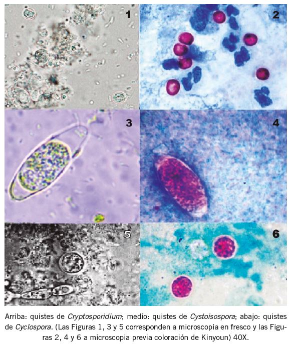 La infección tiene lugar principalmente tras la ingesta de alimentos y/o bebidas contaminadas con ooquistes infectantes, y son expulsados con las heces de los individuos parasitados. En la práctica clínica, el diagnóstico temprano y específico es crucial para manejar las infecciones oportunistas.