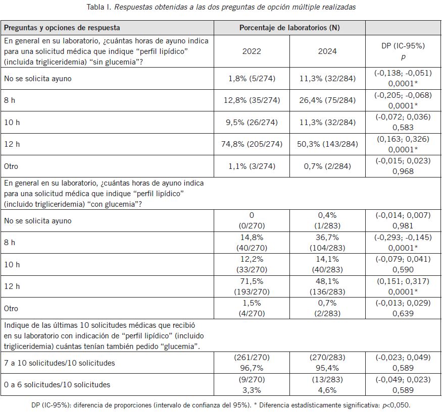 Se realizó una encuesta voluntaria on-line a través de la página web del PEEC (14). La encuesta estuvo disponible para los laboratorios participantes del PREAL durante el período marzo-abril de 2022 y agosto-septiembre de 2024. Junto a la encuesta se adjuntó un resumen explicativo y bibliografía actualizada sobre la evidencia científica que avala la indicación de no ayuno para la determinación del perfil lipídico. Los laboratorios respondieron la encuesta y posteriormente recibieron un informe de los resultados obtenidos junto a un comentario referente al análisis e interpretación de los mismos. La base de datos con las respuestas recibidas fue anonimizada. Las preguntas realizadas y sus opciones de respuesta se detallan en la Tabla I. Se utilizó el programa estadístico EpiDat 3.1 (Xunta de Galicia, España) para evaluar el intervalo de confianza del 95% (IC-95%) para la diferencia de proporciones (DP). Se consideró un valor de p>0,05 para establecer una diferencia estadísticamente significativa. Cabe aclarar que la inscripción y la participación de los laboratorios del PEEC en el PREAL es voluntaria y no arancelada.