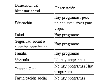 Como se evidencia en el cuadro Nº 2, con la excepción de las dimensiones relacionadas a la vivienda y al trabajo; pareciera que el adulto mayor panameño contara con un cuerpo legal e institucional importante, el cual generaría las condiciones para el bienestar social de esta población. No obstante, este no solo no es el caso, sino la gran mayoría de estas leyes y decretos han caído en letra muerta. Por ende, algunos de estos estatutos no tienen injerencia alguna en la realidad social de estas personas (Valdés Tola, 2011). Por otra parte, vale la pena reflexionar analíticamente respecto a las dimensiones sociales supuestamente protegidas. Así, las que tienen carácter exclusivo para las personas mayores son aquellas referenciadas por la gerontología clásica, por ende, representan la visión estructurada del capitalismo avanzado, en donde los viejos no tienen otra preocupación que la salud y, la seguridad social (jubilación o pensión) o los subsidios económicos (para adultos mayores no asegurados); además, del interés particular por el ocio y la participación social. Aspectos todos, de carácter pasivo.