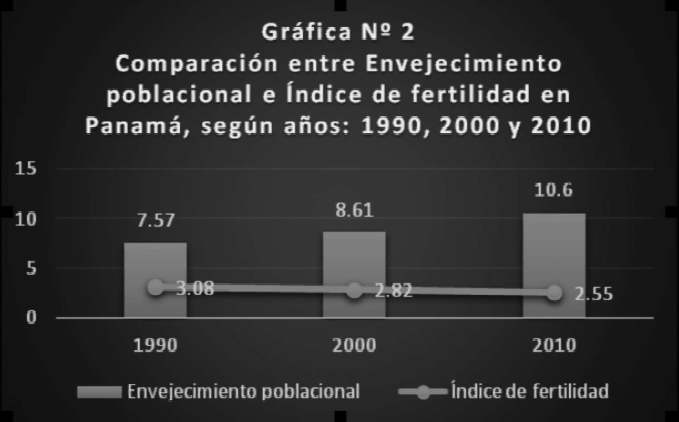 En cuanto al envejecimiento poblacional del istmo, este ha ido creciendo desde 1990 hasta el 2010. En contraste, el índice de fertilidad ha ido disminuyendo sistemáticamente. Ambos aspectos, como se ha mencionado, son fundamentales para determinar el envejecimiento poblacional de una sociedad. Actualmente, Panamá tiene un 10,60 por ciento de población mayor de 60 años, lo cual, en términos demográficos sugiere que es una sociedad en avanzado5 proceso de envejecimiento demográfico (Ver gráfica Nº 2).