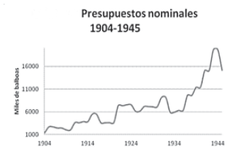 La inflación en EEUU durante las dos guerras (102 por ciento entre 1915 y 1920; 30 por ciento entre 1940 y 1945) y la deflación durante la Gran Depresión (-35 por ciento entre 1929 y 1932) afectaron la capacidad de los presupuestos panameños para adquirir bienes norteamericanos, aunque obviamente la capacidad de adquirir productos y servicios panameños dependería de la mezcla entre bienes importados y nacionales en las compras estatales, de la inflación panameña y del nivel de salarios de los empleados del sector público. El presupuesto de ingresos y egresos que se legislaba, en aquella época, por períodos bianuales nos muestran una evo- lución bastante positiva de la capacidad de gasto del Estado panameño que aumenta considerablemente durante la bonanza de los años veinte y de nuevo por un auge durante los años cuarenta, propiciada por el gasto militar de EEUU en el territorio con la construcción de muchas bases aéreas, navales y del ejército.