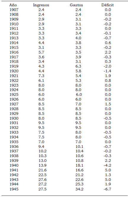 Para completar la situación fiscal de largo plazo presentamos la relación entre ingresos y gastos, anualizando las partidas que eran aprobadas por bienios. Allí se puede observar la práctica de una equivalencia entre ingresos (que incluyen entradas por financiamiento interna y externo) y gastos entre 1907 y 1940, con equilibrios durante casi todo el período, incluso con algunos años de superávit y la presencia de un déficit durante la primera guerra mundial en dos años, que fueron relativamente pequeños.