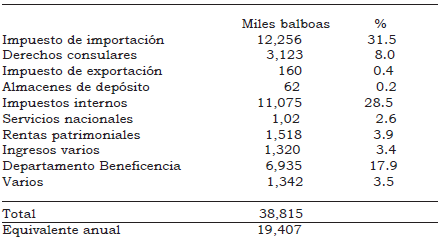Hacia 1937, los impuestos indirectos al comercio exterior sumaban 44.2 por ciento de los ingresos del fisco y los impuestos internos habían perdido participación, aportando 23.1 por ciento del total. También perdió participación la renta derivada de la anualidad por el uso del Canal, aunque no parecen figurar los rendimientos de las inversiones hechas en el mercado inmobiliario de Nueva York, que también venían reduciéndose como se verá más adelante.