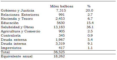 Por el lado de los gastos, se destaca la pérdida de participación de la educación, con 15.4 por ciento frente al 20 por ciento que ocupaba en los años veinte, aunque se trata de un bienio en medio de la segunda guerra mundial, en el que se aumentan fuertemente los ingresos del gobierno panameño frente al promedio de la década anterior. Los maestros hicieron huelgas en 1942 que ganaron y lograron ser adscritos al servicio civil, sus sueldos mejoraron y se prepararon mejor en escuelas normales y en la universidad. Aunque una universidad nacional fue establecida en 1935, mantenía una matrícula baja y sólo en 1946 fue fortalecida y recibió el nombre de Universidad de Panamá. En 1942, salubridad y obras son clasificados conjuntamente y ocupan la mayor parte del gasto público, un 36 por ciento del total. El servicio de la deuda, junto con los imprevistos, alcanza 15.6 por ciento del to- tal, por encima del gasto en educación.