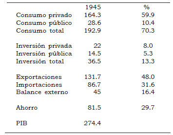 En 1945, el sector público representaba el 15.8 por ciento del PIB, entre consumo del gobierno e inversión pública, que por comparación con su antigua matriz, Colombia, era más del doble de participación para el mismo año.3 El año de 1945 fue atípico porque las exportaciones fueron mayores que las importaciones, debido a la represión de la producción civil de EEUU que generó superávit comerciales en toda la región durante la segunda guerra mundial. El superávit comercial de 16.4 por ciento del PIB queda contabilizado como parte del ahorro de casi el 30 por ciento del PIB, que sobrepasa amplia- mente la inversión total (13.3 por ciento del PIB). En los años posteriores, Panamá comienza a correr de nuevo déficit sistemáticos de su balanza comercial y su ahorro forzoso va disminuyendo.