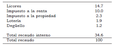 Como puede observarse de la distribución de los impuestos en 1940, casi 15 por ciento tasaba el consumo de licor, el impuesto a la renta aportaba 10 por ciento, el impuesto a la propiedad sólo el 2.3 por ciento, el impuesto a la Lotería cerca del 2 por ciento y el de carne vacuna el 1.2 por ciento. Los impuestos llamados internos alcanzaban el 35 por ciento del total, mientras que los aranceles y derechos consulares sumaban el 65 por ciento del recaudo.