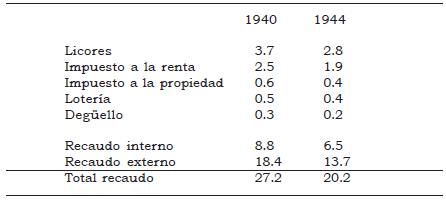 En términos del PIB, el recaudo total mordía el 27 por ciento en 1940, con cerca del 9 por ciento de ingresos por actividades internas y 18 por ciento por arancel y derechos consulares. En 1944 se había reducido la participación impositiva en el PIB, pues este creció más rápido que la recaudación, mostrando su poca elasticidad frente al ingreso; se mantenía la estructura desigual de dos tercios derivado de los impuestos al comercio y un tercio a los impuestos a la renta, la propiedad y a los licores.