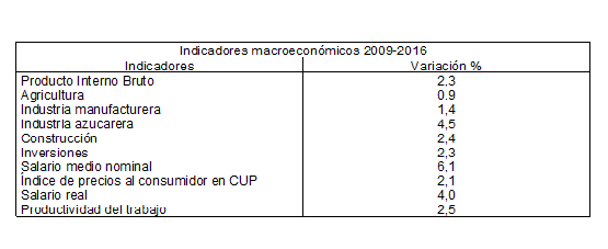 A partir de los desequilibrios que provocaron una caída del 0,9 por ciento en el PIB en 2016, el plan del pasado año8 se propuso frenar esa tendencia depresiva mediante un conjunto de medidas que permitieran lograr un crecimiento del 2 por ciento, sustentado en un incremento del 30 por ciento en la industria azucarera y del 8 por ciento del valor agregado en el sector de hotelería y restaurantes, así como con aumentos entre 2 y 5 por ciento para la agricultura; industria manufacturera; transporte y comunicaciones; construcción; electricidad, gas y agua y comercio, en este caso con un incremento del 3,3 por ciento en la circulación mercantil minorista. El resto de la economía se informó que crecería un 2,7 por ciento. Igualmente, se señaló que decrecería el sector de la minería un 5,2 por ciento –básicamente por caída en la producción de níquel- y que disminuiría la producción de petróleo y gas un 4,3 por ciento. Se destacaba, así mismo, el fuerte crecimiento previsto para las inversiones, aunque la inversión extranjera directa sólo representaría el 6,5 de la misma. Finalmente se daba a conocer que la productividad debía crecer un 6,6 por ciento y el salario medio un 3,5 por ciento.