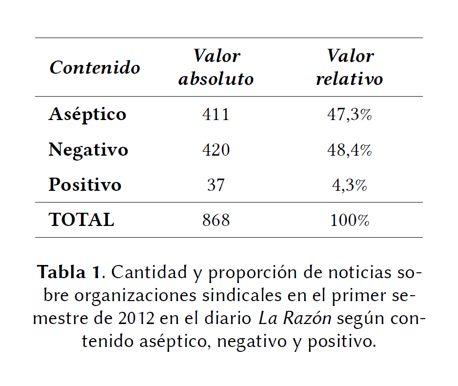 Un primer análisis de la base de datos elaborada sobre estas noticias desvela que la mayor parte (el 48,4%) de las noticias del diario que trataban directamente sobre sindicatos contenía afirmaciones negativas sobre estas organizaciones. El 47,3% estaban redactadas en términos asépticos y sólo el 4,3% contenían asociaciones positivas sobre los sindicatos (ver tabla 1). La alta proporción de titulares y entradillas que contenían afirmaciones negativas sobre los sindicatos demuestra que este diario pretende formar un estado de opinión desfavorable hacia estas entidades.