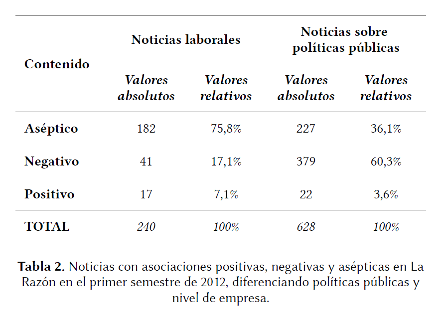 En concreto, el artículo ha estudiado las noticias publicadas por el diario conservador La Razón en el primer semestre de 2012. Analizando titulares y entradillas se ha comprobado que la mayor parte (el 48,4%) de las noticias sobre sindicatos contenía proposiciones negativas sobre éstos, el 47,3% estaban redactadas en términos asépticos y el 4,3% tenían un contenido de carácter positivo. Estos datos demuestran que existe una tendencia hacia el cuestionamiento del sindicalismo a través de mecanismos discursivos, mecanismos que en la sociedad-red son un elemento clave en la acción política.