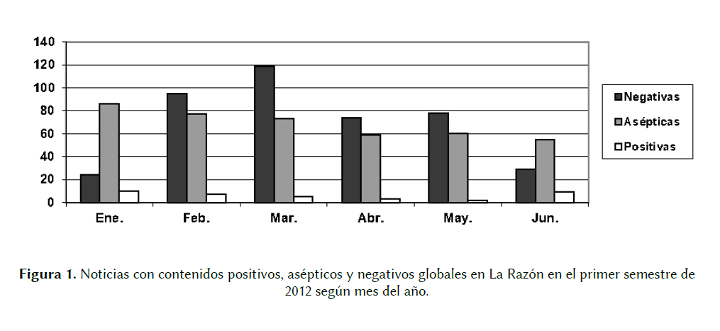 Noticias con contenidos positivos, asépticos y negativos globales en La Razón en el primer semestre de 2012 según mes del año.