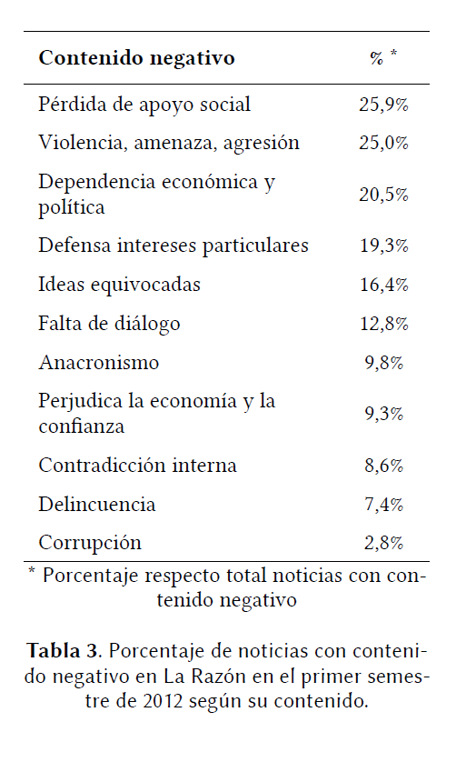Respecto a los contenidos de titulares y entradillas, la mayor parte de éstos se centra en la pérdida de apoyo social (25,9%) y al empleo de la violencia, la amenaza y la agresión (25,0%). Otros contenidos negativos, por orden de importancia son: la dependencia económica y política (20,5%); la defensa intereses particulares (19,3%); tener ideas equivocadas (16,4%); la falta de diálogo (12,8%); el carácter anacrónico de sus estructuras e ideologías (9,8%); que su acción perjudica a la economía y la confianza del país (9,3%), sus marcadas contradicciones internas (8,6%); el carácter delictivo de sus actividades (7,4%); los casos de corrupción de dirigentes (2,8%). A esta tabla habría que sumarle un 4,8% de las noticias que consisten en desprestigiar a determinados líderes sindicales. Dado que un mismo titular podía contener más de uno de estos contenidos la suma de los porcentajes supera el 100% (ver tabla 3).