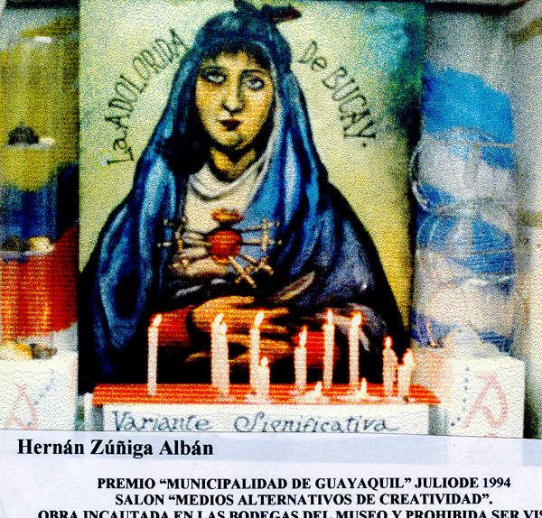 La obra fue censurada y prohibida su exhibición en el año 1994 por parte del alcalde de Guayaquil, Ing. León Febres Cordero, quien consideraba que su naturaleza formal y de significación atentaba contra la religiosidad cristiana de quienes asisten al Museo Municipal de Guayaquil (MUMG), Ecuador (Cabrera Kosisek, 2014). Coincidiendo con Sarduy (2011) “Como la retórica barroca, el erotismo se presenta como la ruptura total del nivel denotativo directo y natural del lenguaje —somático—, como la perversión que implica toda metáfora, toda figura” (p. 34). Perversión, porque la obra se ubicaba al límite de lo pornográfico, atentaba contra la institución museo e institucionalidad religiosa, por lo cual fue “desterrada” a las bodegas del museo en cuestión.