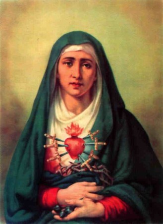 La Virgen de los Dolores o Madre Dolorosa, Figura 2, en Ecuador “La Dolorosa”, es un ícono de la religiosidad popular ecuatoriana. Rodeada de un manto oscuro, cuenta con un traje grana y oro, con este color de fondo. Tiene 7 dagas insertas en el corazón y otras 3, además de ramas de espinas, debajo de él. La vestimenta se encuentra manchada de sangre en la parte donde están incrustadas las dagas. De mirada profunda connota tristeza y es signo de advocación de la Virgen María, por lo tanto, es: doliente, sufrida, sacrificada y piadosa.