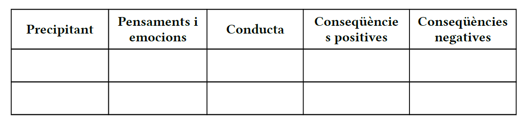 Mitjançant l’esquema A-B-C, terapeuta i client poden operativitzar les conductes, valorant els aspectes positius i negatius dels propis valors i els aspectes a millorar d’aquests a través del registre de cognicions, emocions i conductes i les variables que funcionen com antecedents i com a conseqüents (Taula 1).
