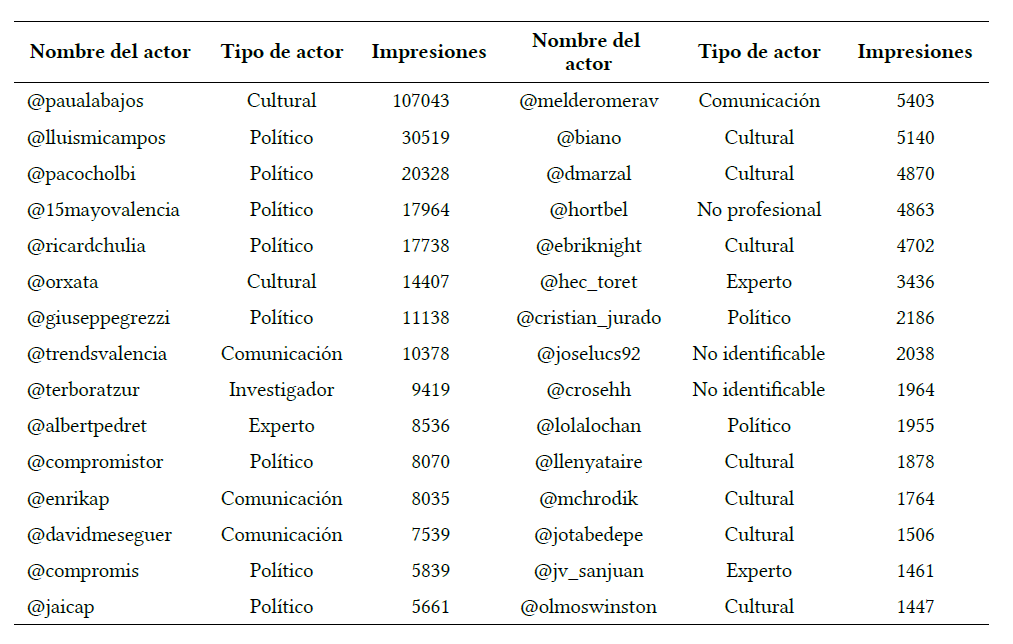 Algunas de las aportaciones clásicas de la cultura digital suelen insistir en la idea de las “multitudes inteligentes”, la “inteligencia colectiva” o la “sabiduría de las masas”, dando a entender que los movimientos en red tienden a funcionar en base a interacciones igualitarias entre agentes sociales diversos, sin atender a las posiciones sociales o el estatus que mantienen en el “mundo real”. En su etapa inicial, el fenómeno de #primaveravalenciana fue impulsado por un grupo con un cierto grado de cohesión, liderado por políticos y artistas, al que más tarde se sumarían personas de índole más variada. En muchos casos se trata de individuos con habilidades avanzadas, dotados de una importante conciencia social y alejados (tanto institucional como mentalmente) de las elites gobernantes. En cuanto a los políticos, se trata, en la mayoría de los casos, de personas vinculadas al partido Compromís, que en estos momentos no es el partido mayoritario de la oposición y no cuenta con las conexiones mediáticas de los dos principales partidos políticos (PP y PSPV-PSOE). En el caso de los artistas, encontramos cantautores, escritores, artistas plásticos que se mueven en circuitos minoritarios, algunos de ellos con un reconocimiento restringido, y que no forman parte del establishment cultural del momento. El papel de estos dos colectivos es esencial para mantener la etiqueta en un estado latente hasta su explosión viral el día 20 —producida, entre otras causas, por el empeoramiento de la situación en las calles. Los participantes no profesionales son relevantes, pero en ningún caso mayoritarios—, esto cambiará radicalmente cuando se viralice la etiqueta. Si clasificamos los veinte tuiteros más influyentes, según las impresiones alcanzadas por sus mensajes, observamos cómo, efectivamente, los perfiles políticos y culturales dominan sobre el resto.