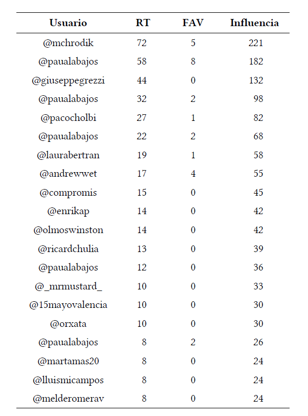 Hemos seleccionado y comentado anteriormente algunos de los usuarios y mensajes más influyentes que ahora recogemos en la tabla 2 de manera sintetizada donde aparecen los influyentes fundacionales según puntuación de influencia. En ella se observa cómo el centro de atención (medido según el número de retuits y favotitos de cada mensaje) se produjo en un conjunto muy reducido de tuits. Los mensajes de @mchrodick, @paualabajos y @giuseppegrezzi, antes comentados, se sitúan en los puestos más altos y destacan claramente sobre los demás.