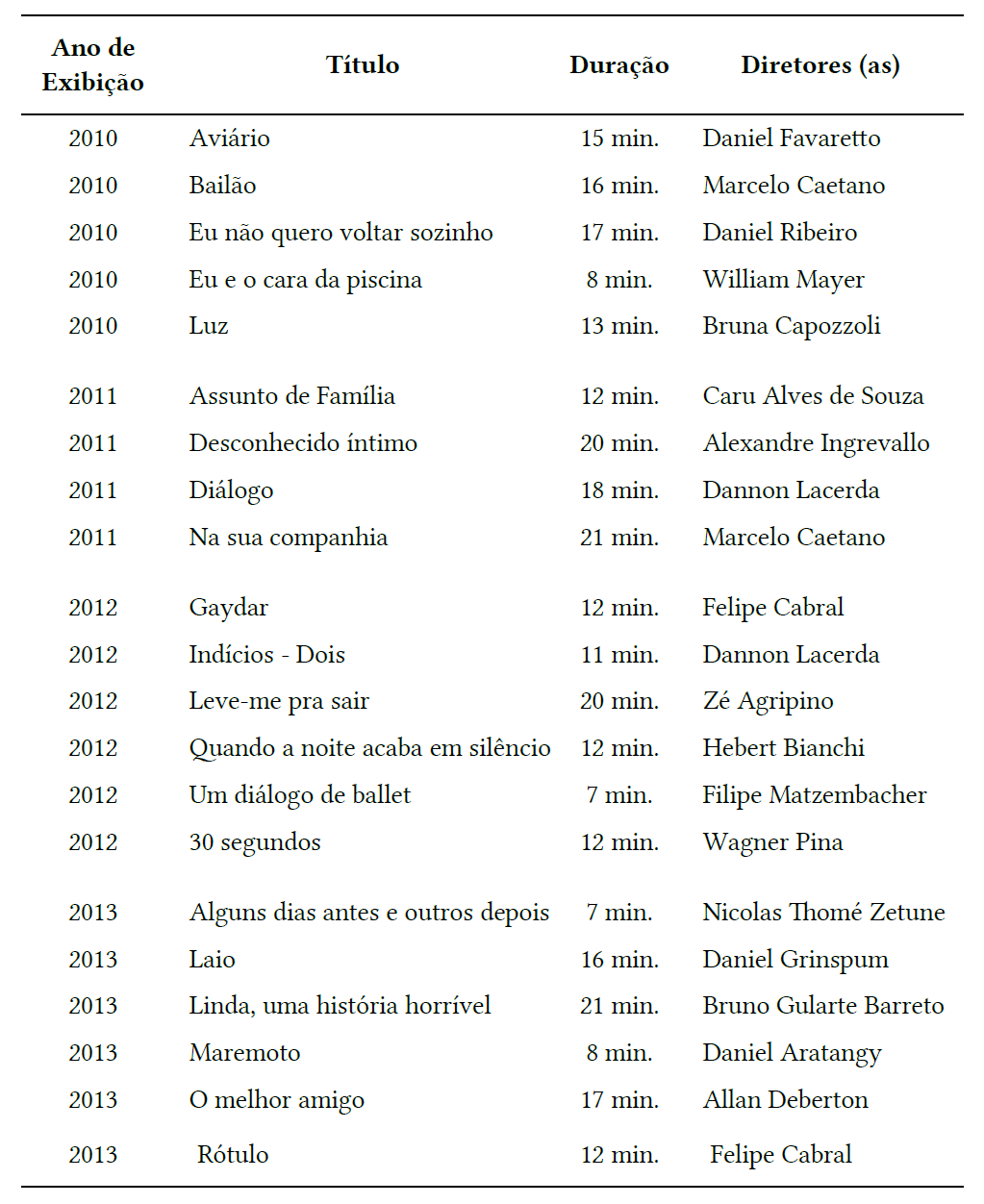 Deste modo, neste artigo, ousamos aventurarmo-nos pelos territórios dos desejos retratados em curtas-metragens protagonizados por cis-homens7 gays exibidos no Festival Mix Brasil de Cultura da Diversidade entre os anos de 2010 a 2013, tendo como foco as discussões empreendidas em torno do curta-metragem Eu não quero voltar sozinho, de Daniel Ribeiro, exibido no ano de 2010. Nestas análises buscamos mapear os modos como são produzidos os discursos, os desejos e as performances de gêneros das sexualidades dissidentes à heteronormatividade. Para tanto, nosso campo de análise se configurou em 21 curtas-metragens que se encontravam disponíveis para acesso (ver tabela 1).