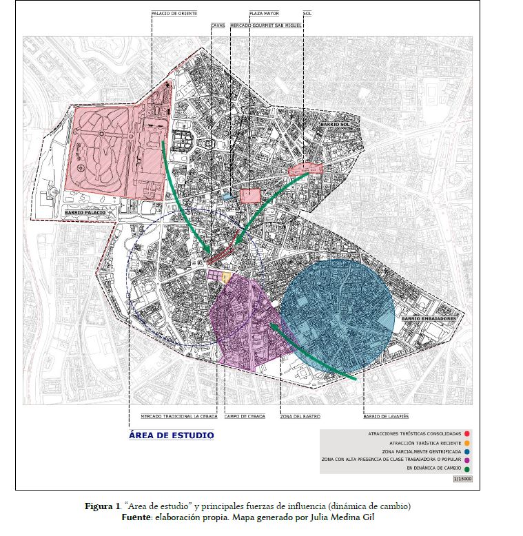 En la actualidad, se está produciendo un proceso de turistificación a través del incremento de la vida nocturna en el barrio de La Latina. Este proceso se inserta dentro de las lógicas urbano-espaciales de la ciudad de Madrid y de su centro urbano (Sequera y Janoschka, 2015), caracterizado por la tendencia hacia la terciarización de servicios, especialmente aquéllos destinados a uso turístico. La espacialización de los usos de la ciudad de Madrid parece haber llevado a que el barrio de La Latina haya experimentado una intensificación de su oferta de servicio gastronómico y nocturno, con una afluencia creciente de visitantes temporales, especialmente durante los fines de semana y en la noche. La repercusión se ha dejado notar entre algunos “residentes tradicionales” (Quaglieri y Russo, 2010), caracterizados por un fuerte sentimiento de arraigo al lugar.