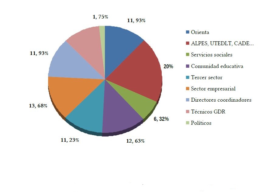 Las entrevistas realizadas las dirigimos estratégicamente a informantes clave. Atendiendo a la relevancia sectorial, las organizaciones y profesionales considerados relevantes fueron aquellos relacionados con las políticas sociales activas, con las políticas de educación y la formación, con los servicios sociales, con el tercer sector, con la empresa privada y con sus asociaciones. También se consideró relevante las voces de los usuarios de estos servicios. Dentro de estos contextos, seleccionamos estratégicamente los informantes clave a partir de los cuáles poder obtener la información para identificar los actores relacionados con el objeto de estudio. También seleccionamos los sujetos atendiendo a criterios que garantizaran una información cualificada, concretamente en función de su cargo (político, director/a o coordinador/a, técnico, empresario/a, agente social, etc.) y/o grado de conocimiento del sector (figura 1).