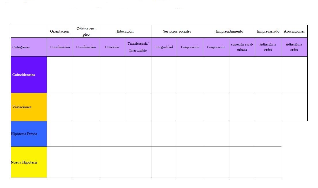 Con respecto a la recopilación documental procedimos al análisis de los planes estratégicos de los distintos territorios. Se trata de documentos básicos para el conocimiento del territorio, que derivan de la reflexión y participación de todos los implicados en el mismo, como protagonistas en la proyección de su futuro. Determinamos el criterio de seleccionar todo aquello relacionado con aspectos clave de la gobernanza y con las políticas sociales activas. Asimismo, se llevó a cabo la actualización de un inventario completo de recursos y dispositivos relacionados con las políticas sociales activas con el fin de conocer los principales actores que desempeñan tareas relacionadas en el territorio objeto de investigación: oficinas de empleo, centros educativos, centros de servicios sociales comunitarios, oenegés, asociaciones de empresarios, centros de I+D, etc. Paralelamente, prestamos atención a las posibles buenas prácticas que se estuvieran llevando a cabo.