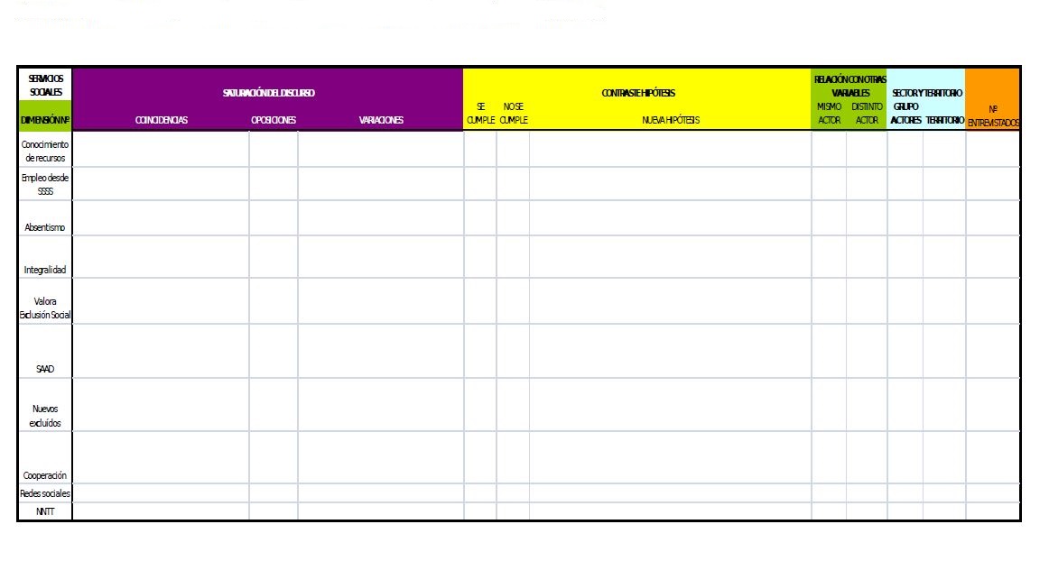 Para el análisis de contenido recogido por cada grupo de actores utilizamos el Método Comparativo Constante (Valles, 1999/2007) que se centra más en la generación de teoría conceptual que en la prueba provisional para analizar el contenido. Este método orienta el análisis a la saturación de la información y no al logro de certezas universales. Para saturar los diferentes discursos realizamos una labor de deconstrucción apoyándonos en una herramienta metodológica, la plantilla de análisis de discurso (ver anexo III), que conjuga coincidencias, oposiciones y variaciones en los discursos.