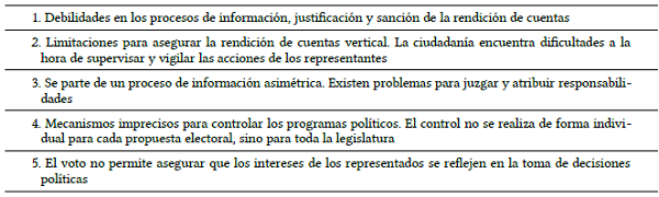 El análisis de los principales estudios de la representación democrática refleja cómo la dimensión de la rendición de cuentas se encuentra en crisis. Se ha destacado su carácter eminentemente electoral, en el que el voto se sitúa en el centro del proceso de con- trol político por parte de la ciudadanía. Distintas investigaciones han enumerado di- versas deficiencias en este método de rendición de cuentas electoral. Entre ellas, hemos destacado cinco limitaciones fundamentales: 1) las debilidades en los procesos de información, justificación y sanción de la rendición de cuentas; 2) las limitaciones de la ciudadanía para supervisar y vigilar las acciones de los representantes; 3) que se parte de un proceso de información asimétrica y existen dificultades para juzgar y atribuir responsabilidades; 4) la imprecisión para controlar los programas políticos, ya que el control no se realiza de forma individual en cada propuesta; y, por último, 5) el hecho de que el voto no permite asegurar que los intereses de los representados se reflejen en la toma de decisiones políticas.
