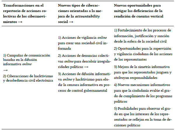 Podemos determinar que estos tipos de acciones colectivas que se llevan a cabo desde los cibermovimientos están creando nuevas posibilidades para mejorar las deficiencias de la rendición de cuentas, fundamentalmente en cinco aspectos. En primer lugar, pueden fortalecer los procesos de información, justificación y sanción. En segundo lugar, tienen la capacidad de crear oportunidades para la supervisión y vigilancia ciudadana de las acciones de los representantes. En tercer lugar, pueden mejorar la simetría informativa para que los representados juzguen y atribuyan responsabilidades. En cuarto lugar, pueden crear nuevos mecanismos informativos para que los ciudadanos evalúen el grado de cumplimiento de los programas políticos. En quinto lugar, pueden aportar posibilidades para observar el grado en que los intereses de los re- presentados se reflejan en la toma de decisiones políticas.