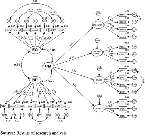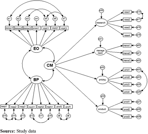 With relation to the measure of sampling adequacy (KMO), Hair et al. (2009) suggest that the value should be >0.50. It can be observed that all of the values for the entrepreneurial orientation and business performance constructs are as expected, but one of the variables from the promotion dimension of marketing capability had communality and measure of sampling adequacy values <0.5 and a factor loading <0.7. This variable was therefore excluded from the promotion dimension. All of the other variables in this dimension had satisfactory results, as did the variables for the dimensions market management, market research, pricing and new product development. Still with relation to marketing capability, which comprises five factors, the individual factor loadings for each dimension were analyzed. All of the factors for all five dimensions had eigenvalues >1, and total variance explained by marketing capability was 67.277 per cent. However, cross loadings of >0.3 were observed, which are considered high and could indicate that a given dimension is explained by more than one factor, and there were just two variables in the promotion dimension, with no apparent values with factor loadings >0.3. For this reason, the decision was taken to exclude the promotion dimension from the model because it had proven impossible to measure it using confirmatory factor analysis.