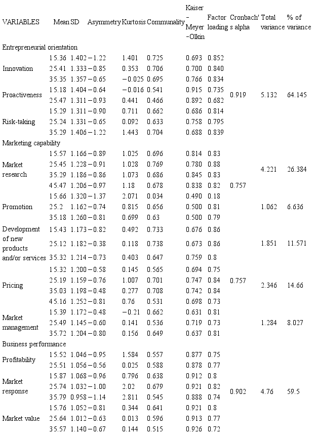In summary, the analyses of the data collected for this study using exploratory factor analysis were performed with the 33 observable variables that comprise the three constructs: entrepreneurial orientation, business performance and marketing capability. After these analyses, only 32 were identified as observable variables, as the variable proactiveness 2 exhibited an exploratory factor loading of 0.466 and was therefore eliminated. The remaining variables underwent tests that are described below to identify whether they were relatively significant for measurement of the study constructs.