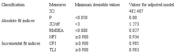 When using structural equations modeling, there is no single method for fitting the model, as they vary depending on model complexity. As suggested by Hair et al. (2009), this study uses measures that compare observed data with the model’s predictions as follows: absolute measures of fit, incremental measures of fit and parsimonious measures of fit.