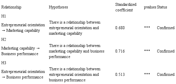 This hypothesis was confirmed with a standardized factor loading of 0.513, achieving another part of the objective, which was to identify a relationship between entrepreneurial orientation and marketing capability.