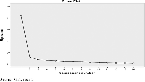 The number of factors defined is based on the results of eigenvalues, also known as latent root criteria, superior to 1. Here, only the components – factors – with eigenvalues greater than 1 are considered significant (Hair et al., 2009). This measurement may be observed in Figure 1, which presents the number of factors to be extracted through a scree plot.