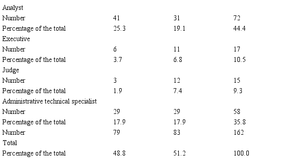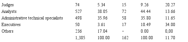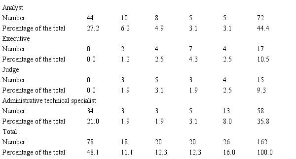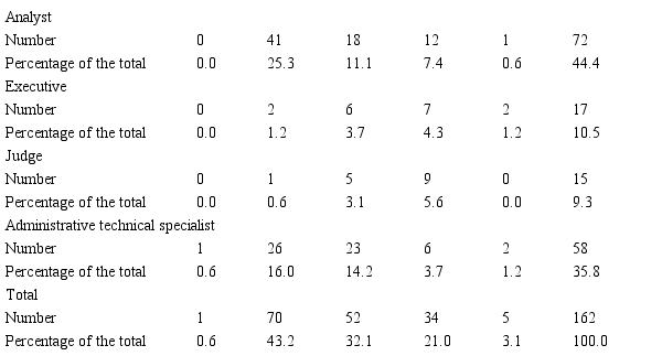 We can see in Table V that the frequency of the positions by age group is statistically different with a significance level of 1 per cent. We may also observe in this table that of the 43.2 per cent of the respondents, who are in the 26 to 35 years age group, 25.3 per cent are analysts and 16.0 per cent are administrative technical experts. We can also see that the positions of judges and executives are mainly occupied by professionals above the age of 35 years.