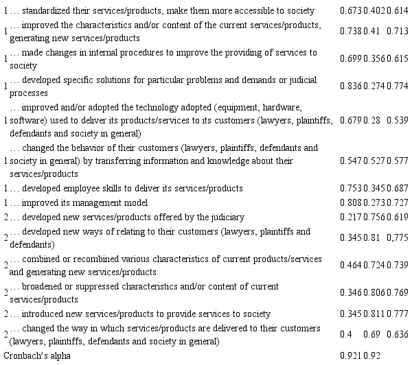 Two factors were obtained from the results, which describe innovations in processes and services in the court studied. In terms of the examples of innovations cited by the respondents, one may note that those related to information and communications technology are the most remembered, especially the introduction of the electronic lawsuit.