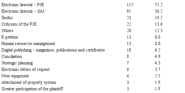 The Superior Council of Labor Justice, through Resolution n° 94, of March 23, 2012, determined that all of the Regional Labor Courts would use the PJE (Electronic Lawsuit) system, therefore substituting all of the previous programs. In the results of Table IX, we can observe that 13.6 per cent of the participants had criticisms regarding this system, including its implementation, which has presented errors given that it is not as mature as the system developed by the local court, as well as its inability to handle particular characteristics of the court. Therefore, even though it is considered an innovation, the flexibility of the PJE needs to be improved to adapt to the necessities of the courts that use this system.