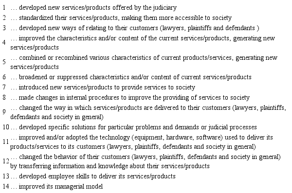 To study innovation in the court, we are using the models of Djellal and Gallouj (2005) and Gallouj and Weinstein (1997), which come from the consolidated theory of innovation in services, making it possible to construct the 14 statements presented in the methodology section.