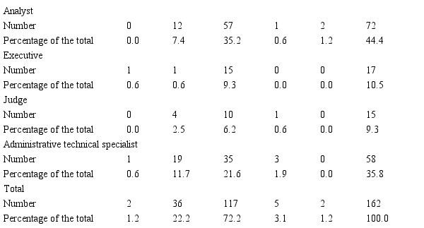 Concerning the length of service of the respondents, we can see that 48.1 per cent of them have had up to 5 years of service in the court, which indicates a new corps of public servants. This may be owing to the realization of recent competitive exams for analysts and administrative technical specialists given that 27.2 per cent of all respondents with less than 5 years of service are analysts and 21 per cent administrative technical specialists. In analyzing the frequency of positions by the length of service, we can see that they are statistically different, at a 1 per cent level of significance, with a p-value found to be 0.000. Thus, we can infer that the length of service among positions is statistically different.