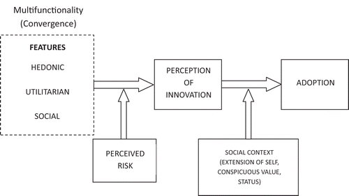 Figure 1 presents the semiotic framework of consumption theory in this technological and innovation context. It is clear that convergence has several characteristics that stimulate and motivate consumers’ interests, although there is a perception of risk involved, both in terms of the number of functions and their diversity and innovation (Harris and Blair, 2006; Kozinets et al., 2017). The increased or reduced perception of this risk impacts the perception of the product, which can be seen as innovative and exciting or even as a danger to the user because of its high risk. The perception of innovation is restricted according to the intrinsic values of the user.