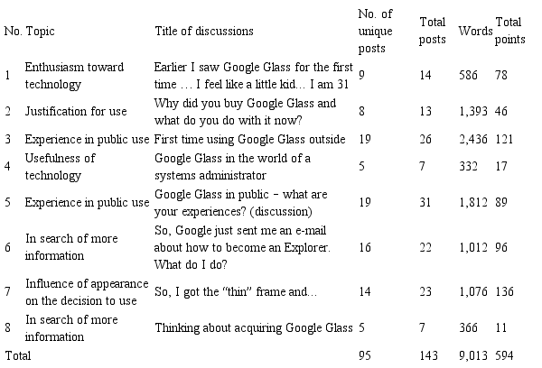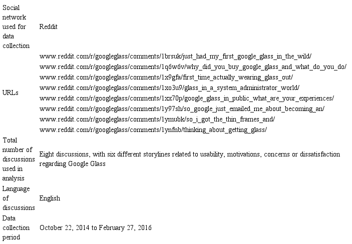 Data were taken from eight different discussions, containing 143 comments from 86 users and a total of 594 points (community votes in favor of posts). Data were collected for discussions with at least seven comments, related to usability, motivations and concerns or dissatisfaction regarding Google Glass.