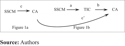 relationship between the independent variable (SSCM), represented in Figure 1(b) by the path c’, and the mediator variable (TIC), represented in Figure 1(b) by path b. Both relations, SSCM and TIC, act as independent variables of the dependent variable (CA).