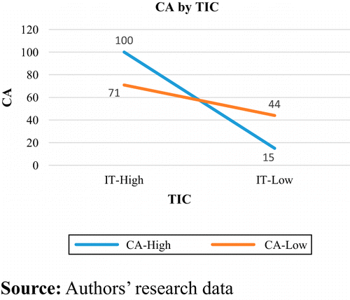 For the direct relation of TIC by CA, the impact of the TIC construct on CA is observed. As in the previous relation, as TIC decreases, so does the competitive advantage (CA), thereby denoting the direct relation between the constructs: