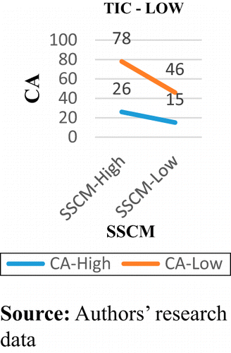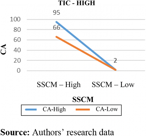 Second, the relationship between the independent variable (SSCM) and the dependent variable (CA) is owing to the mediator variable (TIC) because when exercising control over the test factor, represented by the mediator variable (TIC), as shown in Table VII, the original relationship between the independent variable (SSCM) and the dependent variable (CA) was attenuated: that is, it became weaker.